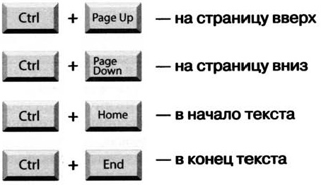 Если текст большой, то на экране будет видна только его часть, а весь он будет храниться в памяти компьютера. Существует режим прокрутки, позволяющий быстро вывести на экран части текста, находящиеся за его пределами. Это можно сделать с помощью полос прокрутки, расположенных справа и внизу окна документа. Для этой цели также можно использовать следующие комбинации клавиш: