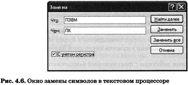 Например, если необходимо в большом тексте заменить аббревиатуру «ПЭВМ» на «ПК», то лучше всего воспользоваться имеющейся в текстовых процессорах функцией поиска и замены (рис. 4.6).