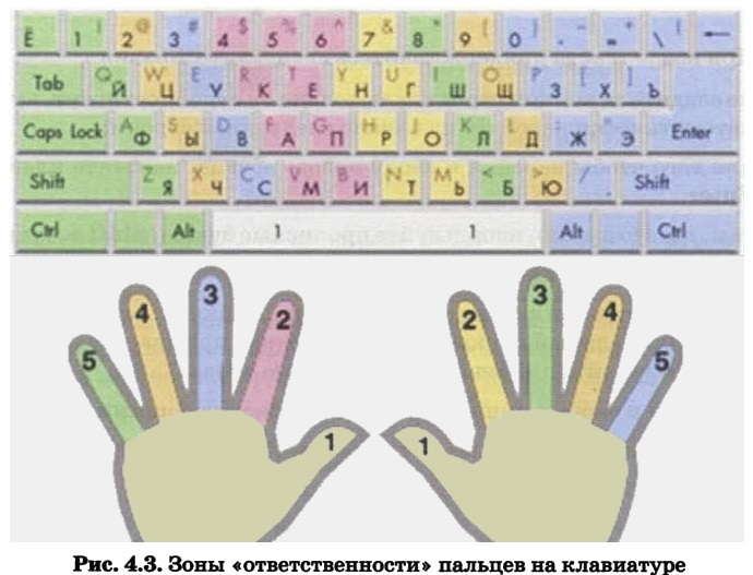 Клавиатура условно делится на две части — для правой и левой рук. Каждый палец «закреплён» за определёнными клавишами (рис. 4.3).