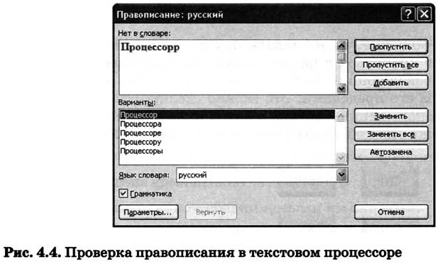 Современные текстовые процессоры снабжены средствами проверки правописания. В простейшем случае текстовый процессор хранит словарь языка и каждое вводимое пользователем слово сравнивает со словами этого словаря. Бели введённого слова в словаре нет, то процессор его отмечает (например, красной волнистой линией) и предлагает варианты замены (рис. 4.4).