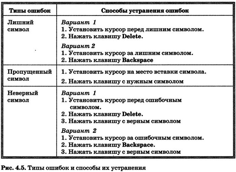 Всё многообразие ошибок, допускаемых при вводе текста, может быть сведено к трём типам: лишний символ, пропущенный символ и ошибочный символ. Способы устранения этих ошибок описаны на рис. 4.5.1